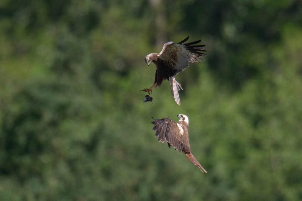 Die sehenswerte Futterübergabe während der Brutzeit ist regelmäßig vor allem in den Monaten Mai und Juni zu beobachten. Dabei steigt das Weibchen vom Nest auf und fängt die vom Männchen herbeigebrachte Beute in der Luft auf. Ein sehr präzises und gut abgestimmtes Flugmanöver, das nur wenige Sekunden dauert. Auch noch später im Jahr wird die Futterübergabe mit den Jungvögeln trainiert.